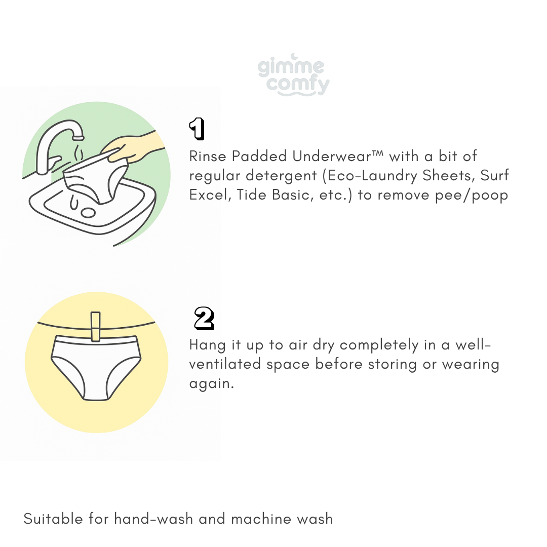 Gimme comfy pants are perfect for daytime training. For overnight use, we suggest layering with an absorbent pad or using them closer to full potty readiness.